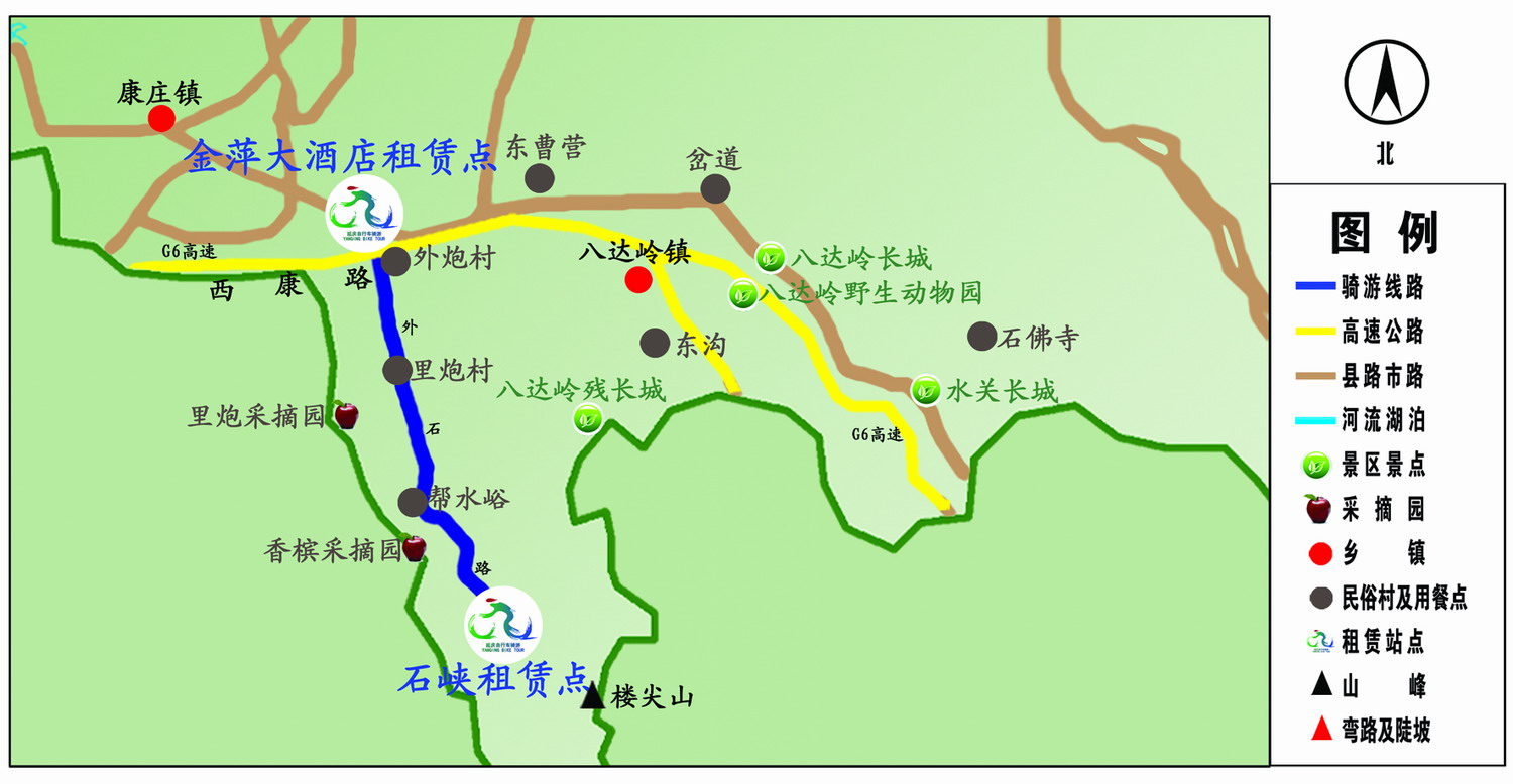 全县有8条骑游线路,其涵盖主要景区景点、民俗村,30个租赁站点(8个租赁点实现通租通还)遍布其间,300余公里的骑游线路串联起丰富的旅游文化资源,2000多辆自行车可供游客选择。推荐线路有妫河生态走廊骑游线路、香龙路骑游线路、百里山水画廊骑游线路、龙庆峡骑游线路。